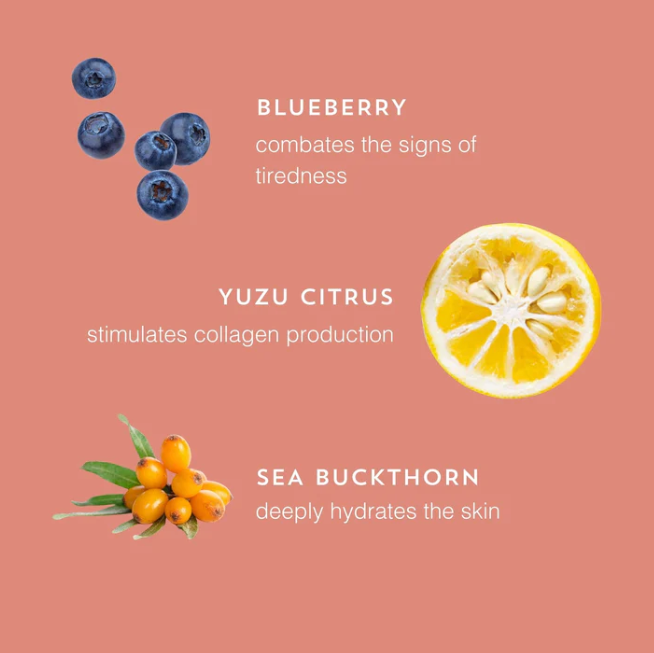 Blueberry is a rich source of Vitamin C, which can help provide essential nutrients to the skin, contributing to a brighter complexion. It is known for its antioxidant properties, which may help reduce the appearance of redness and uneven skin tone, supporting a more even-looking complexion.
