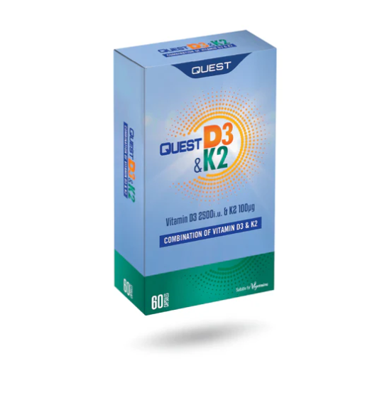 Vitamin D3 and K2 work synergistically in the body to regulate calcium metabolism, supporting bone and heart health. Vitamin D3 is necessary for calcium absorption into the blood stream and the synthesis of proteins activated by vitamin K2 that place calcium into the bone matrix. Vitamin D3 is also vital in the synthesis of proteins that are activated by vitamin K2 and bind to calcium to reduce calcium levels in arteries.