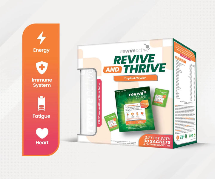Discover your ultimate energy and immune system support. The Revive and Thrive Gift Set contains 30 sachets of Revive Active plus a premium glass bottle to energise your day.